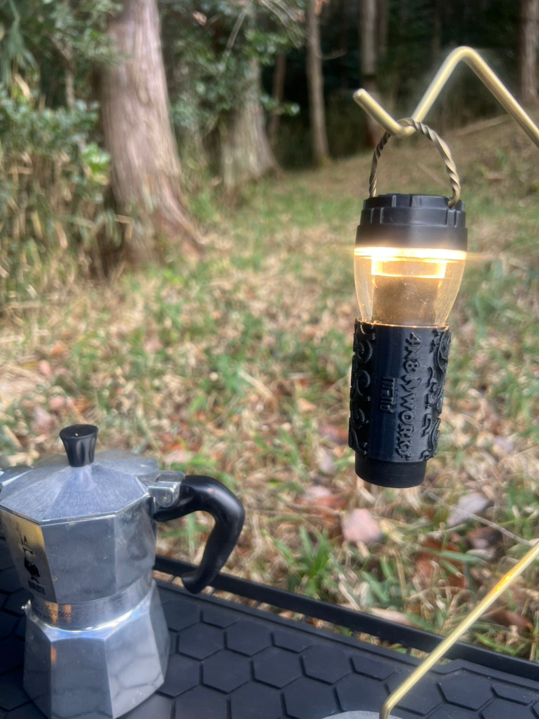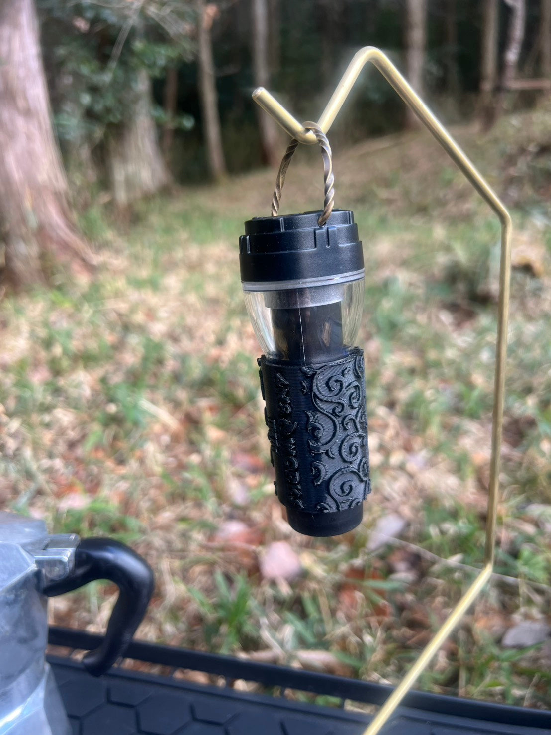 唐草模様のグローブで存在感があり、真鍮ネジネジフックを合わせることでLEDランタンのカスタムが完成します。弾力性のあるグローブで割れにくく、ガラス部分の保護にもなります。フック部分はゴールゼロ等、別商品にも装着可能です。